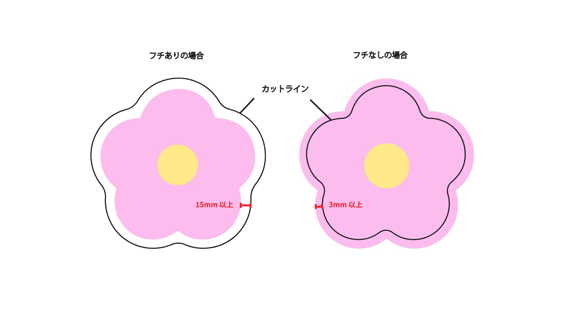 基本的にデザインの端からカットラインまでの幅を15mm以上設ける必要がございます。