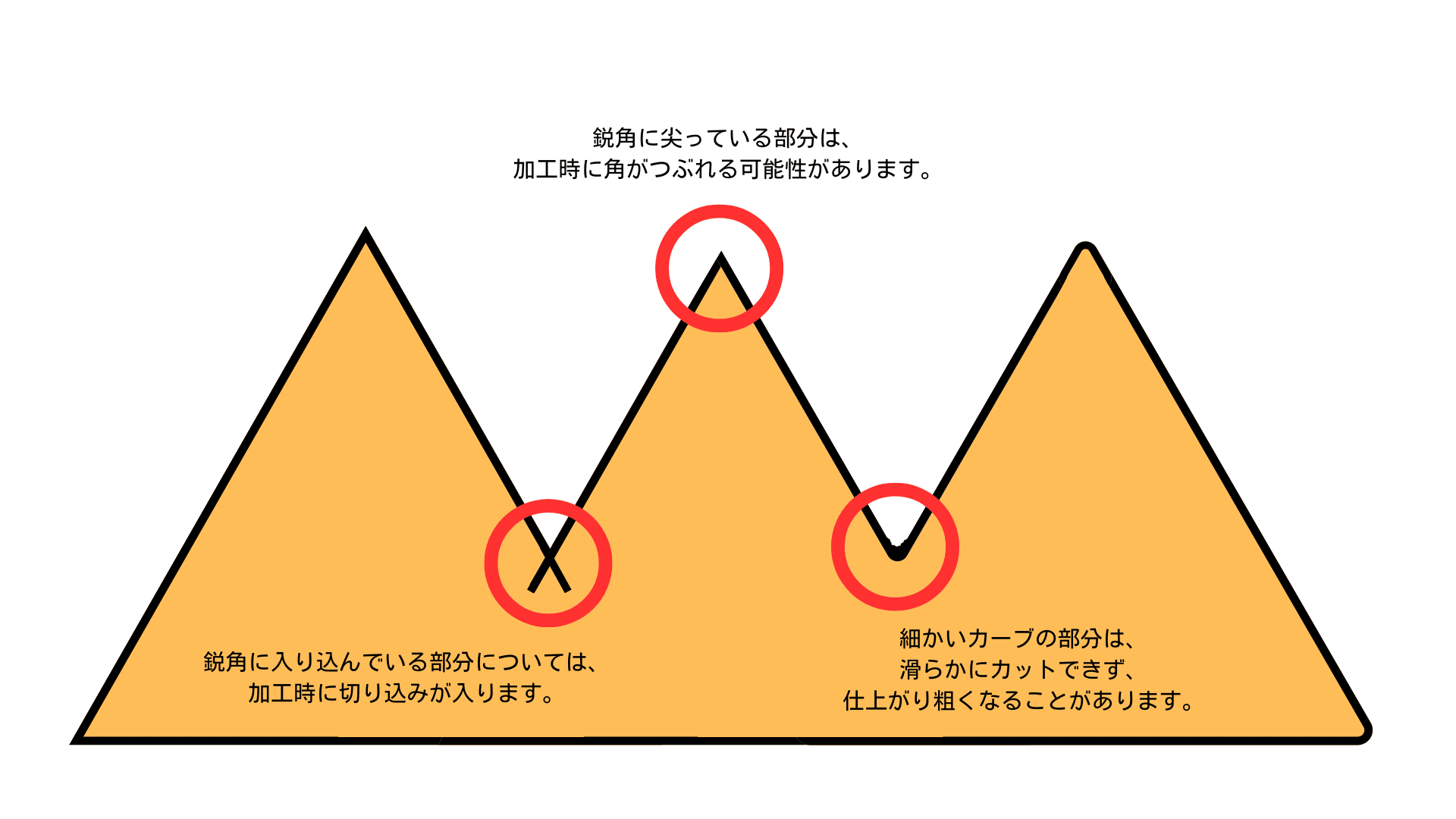 滑らかなカーブに比べてカットが難しく、切り口が粗くなる可能性があります。